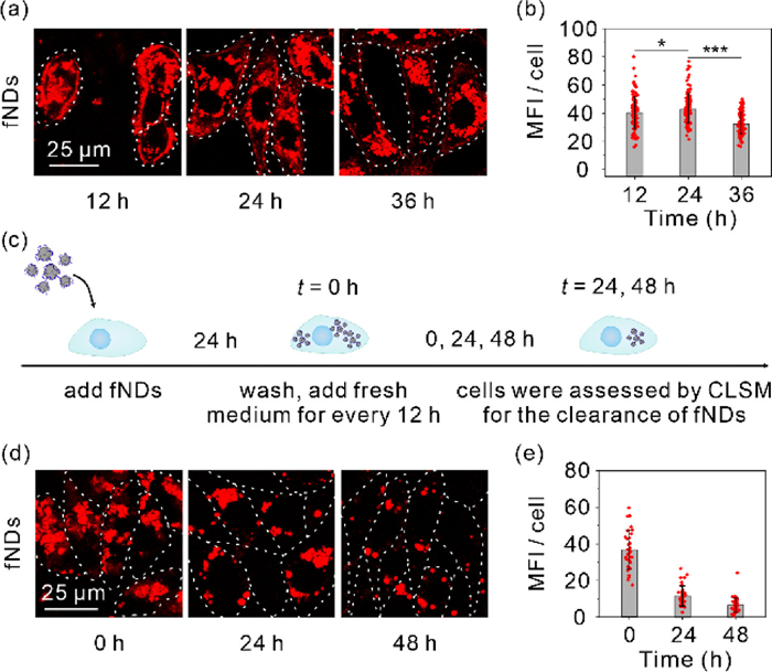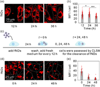 | Fig. 2. Cell uptake and clearance of fNDs. (a) Confocal images of cells and (b) MFI inside the cells after 12, 24 and 36 h incubation. (c) Schematic showing of cells clearance of fNDs. (d) Confocal images of cells and (e) MFI inside the cells after 24 h incubation and at the intervals of 24 and 48 h after the initial 24 h incubation with fNDs. Scale bar: 25 µm. | |
