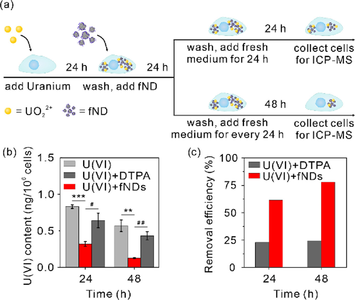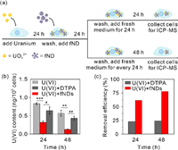 | Fig. 3. Intracellular uranium decorporation by fNDs. Cells were treated with 12.4 µmol/L uranium for 24 h, followed by 50 µg/mL fNDs for 24 h. (a) Schematic showing of intracellular uranium decorporation by fNDs. (b) Intracellular uranium content and (c) the uranium removal efficiency by fNDs. | |