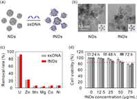 | Fig. 1. (a) Schematic showing of the preparation of fNDs. (b) High magnification TEM images of fNDs. Scale bar: 10 nm. (c) Adsorptionbehavior of ssDNA and fNDs toward uranium and essential metalions (pH 7.4 tris-HCl buffer, m/v = 0.04 g/L for ssDNA and m/v = 0.44 g/L for fNDs, T = 310 K, the initial concentration of uranium and other metal ions were 4.2 ppm and 40–50 ppm, respectively). (d) Dosage-dependent cell growth rate of NRK-52E cells treated with fNDs for 24, 48, 72 h. Results are expressed as the mean ± SD. | |