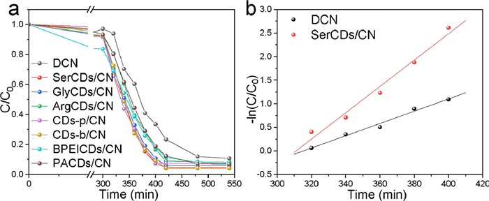 | Fig. 1. (a) The photocatalytic performance of different CDs/CN composites for the elimination of uranium. (b) Photocatalytic rate fitting of DCN and SerCDs/CN. | |