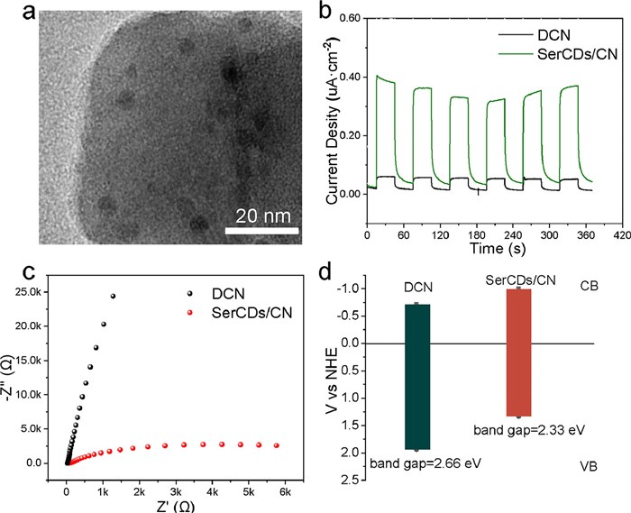 | Fig. 2. (a) TEMimage of SerCDs/CN. (b) Time dependent photocurrent responses under lightirradiation, (c) EIS Nyquist plots and (d) illustration of energy level diagrams of DCN and SerCDs/CN composite. | |