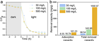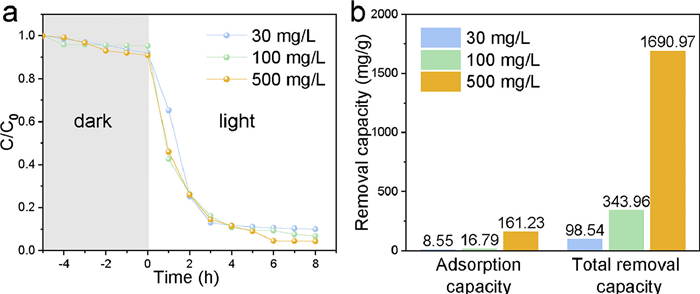| Fig. 3. (a) The photocatalytic performance and (b) the adsorption capacity in the dark condition and the total removal capacity after irradiation of SerCDs/CN with different concentration of uranium. | |
