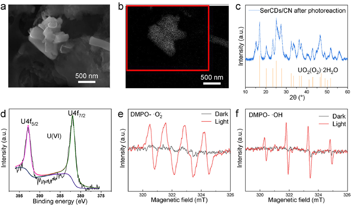 To further understand the mechanism of the photo-assisted adsorption reaction, the final uranium products were collected and characterized with various methods. As show in Fig. 4a, the product on the surface of SerCDs/CN was rod-like, and the ESB mode scanning image in Fig. 4b verified the heavy metal elements were distributed on the rods. The EDX mapping results of this area in Fig. S8 (Supporting information) confirmed the existence of elements C, N, U and O. The XRD pattern (Fig. 4c) clearly showed that new diffraction peaks was obtained after photocatalytic reaction with uranium and the peaks were consistent with UO2(O2)•2H2O (PDF#35–0571). Besides, the valence state of uranium in the product was analyzed by XPS in Fig. 4d and the peaks were identified as U(Ⅵ), which also confirmed the products of uranium were mainly metastudtite.