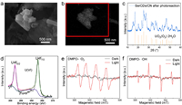 | Fig. 4. (a) SEM image and (b) the ESB mode scanning image of SerCDs/CN after photocatalytic process. (c) The XRD pattern and (d) XPSspectra of the photocatalytic product. EPR signals of (e) DMPO-•O2− spin adducts and (f) DMPO-˙OH spin adducts generated in CH3OH and H2O system, respectively. | |