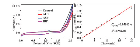 | Fig. 1. (a) The CV curves of Ti/SnO2-Sb/La-PbO2 electrode in 50 mmol/L Na2SO4 solution with/without 100 mg/L ACT, ASP and IBP at scan rate of 10 mV/s. (b) The production of •OH in the electrochemical advanced oxidation, current density of 10 mA/cm2. | |