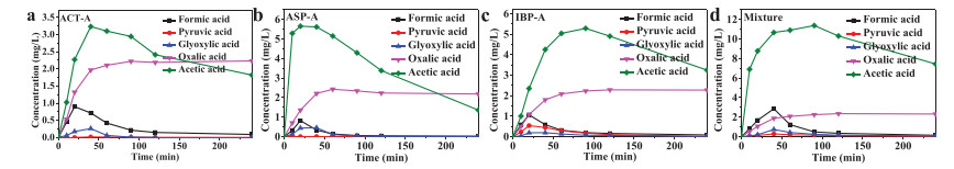 | Fig. 3. The production of carboxylic acids with low molecular in the electrochemical advanced oxidation of ACT (a), ASP (b), IBP (c) and their mixture (d). | |