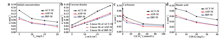 The influencing factors, e.g., initial concentrations, current densities, carbonate concentrations and dissolved organic matter concentrations, on the degradation performance of NASIDs mixture were thoroughly studied. As shown in Figs. S1–S4 (Supporting information), the electrochemical degradation performances of the three NASIDs were all obviously effected by the studied influencing factors. The k values of ACT-M, ASP-M and IBP-M at their concentrations of 5 mg/L were 0.142 min−1, 0.085 min−1 and 0.095 min−1, respectively. These values were decreased to 0.066 min−1, 0.035 min−1 and 0.044 min−1, respectively, when the concentrations increased to 20 mg/L, as shown in Fig. 4a. The higher concentration of NSAIDs and concentration of their degradation intermediates could compete for the constant production of •OH at 10 mA/cm2. Linear increases of the k values were observed when current density was changed from 5 mA/cm2 to 20 mA/cm2 (Fig. 4b), in which the k values were increased from 0.047 min−1, 0.030 min−1 and 0.036 min−1 to 0.172 min−1, 0.124 min−1 and 0.116 min−1 for ACT-M, ASP-M and IBP-M, respectively. There could be higher •OH production at higher current density because of the faster electron transfer and higher anode potential, which caused the more efficient degradation of NSAIDs mixture. The presence of carbonate slowed down the degradation performances of NSAIDs as shown in Fig. 4c, in which the pH value of the solution was not adjusted after the addition of carbonate. After the addition of 1 mmol/L carbonate, the k values were sharply decreased by 18.4%, 14.3% and 19.3% for ACT-M, ASP-M and IBP-M, respectively. However, there were slow decreases of k values when carbonate concentration was increased from 1 mmol/L to 100 mmol/L. There was greater inhibition of ASP-M degradation than ACT-M and IBP-M at higher carbonate concentration. Carbonate can quench •OH in the system, which produces CO3•−. Although the production of CO3•− could accelerate the elimination of oxytetracycline and oxcarbazepine [22], there were inhibitions of norfloxacin and ciprofloxacin degradation in advanced oxidation processes in the presence of carbonate [23, 24]. The different effects were mainly because of the different reaction kinetics between the organic compounds and CO3•−. The presence of humic acid, a typical dissolved organic matter, also inhibited electrochemical degradation performances of NSAIDs as shown in Fig. 4d. The k values were decreased by 46.6%, 40.3% and 54.4% for ACT-M, ASP-M and IBP-M, respectively, after the addition of 40 mg/L humic acid. The quenching of •OH and decrease of electroactive sites on anode surface (adsorption of humic acid) might be the reasons for the inhibitions.