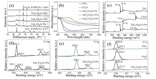 | Fig. 1. (a) XRD patterns of the TiO2/Cu2O composites. (b) UV-DRS spectra of the TiO2, Cu2O and TiO2/Cu2O composites. (c) XPS survey spectra of TiO2, Cu2O and TiO2/Cu2O-15% samples; high-resolution XPS spectra of (d) Cu 2p, (e) Ti 2p and (f) O 1s for different samples. | |