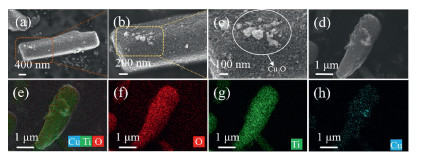 | Fig. 2. (a-c) SEM images of the TiO2/Cu2O-15% sample; (d-h) SEM image of the TiO2/Cu2O-15% sample and its EDX mapping images of O, Ti, and Cu elements. | |