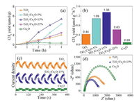 | Fig. 3. Photocatalytic CO2 reduction activity (a) and production rates (b) of TiO2, TiO2/Cu2O-5%, TiO2/Cu2O-15%, TiO2/Cu2O-25%, and Cu2O under light irradiation; (c) transient photocurrent responses and (d) electrochemical impedance spectra of TiO2, TiO2/Cu2O-15%, and Cu2O samples. | |