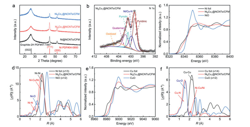 | Fig. 3. (a) XRD patterns of various catalysts. (b) Ni 2p XPS spectra of Ni9Cu1@NCNTs/CFM. (c) Ni K-edge XANES spectra and (d) the Fourier transform of EXAFS data of Ni9Cu1@NCNTs/CFM, Ni foil, and NiO samples. (e) Cu K-edge XANES spectra and (f) the Fourier transform of EXAFS data of Ni9Cu1@NCNTs/CFM, Cu foil, and CuO samples. | |