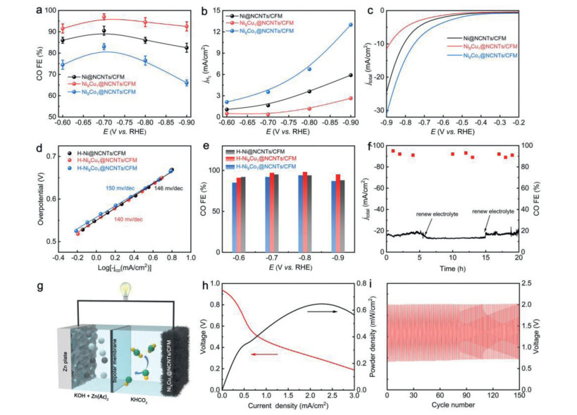 | Fig. 4. (a) CO FE in CO2-saturated KHCO3 electrolyte, (b) partial current densities for H2 and (c) LSV curves in N2-saturated KHCO3 electrolyte of various catalysts, (d) Tafel plots, (e) CO FE of various catalysts ground in HCl, (f) stability test of Ni9Cu1@NCNTs/CFM at −0.8 V vs. RHE for 20 h, (g) schematic illustration for Zn-CO2 battery, (h) discharge polarization and power density curves of Zn-CO2 battery, (i) galvanostatic discharge-charge cycling curves at 0.5 mA/m2 for 150 cycles. | |