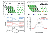 | Fig. 1. (a, b) Top view and side view of the geometric structure of Ni@NC and Ni9Cu1@NC, where substrate hides behind metal atoms. (c) Calculated DOS and (d) the calculated free energy diagrams for HER on the surface of Ni@NC, Ni9Cu1@NC and Ni9Co1@NC. | |