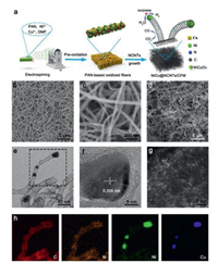 | Fig. 2. (a) Schematic illustration of synthesis of Ni9Cu1@NCNTs/CFM catalysts. (b, c) top view and (d) cross-sectional SEM images of Ni9Cu1@NCNTs/CFM. (e) TEM and (h) corresponding element maps images of Ni9Cu1@NCNTs/CFM. (f) the magnified TEM image of Ni9Cu1 NPs. (g) HAADF-STEM images of Ni9Cu1@NCNTs/CFM. | |