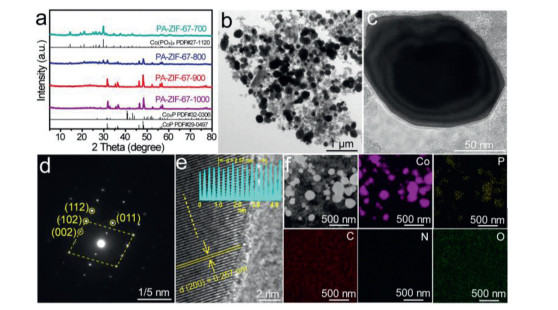 | Fig. 1. Structure and morphology characterization of PA-ZIF-67–900. (a) XRD patterns of PA-ZIF-67–700, PA-ZIF-67–800, PA-ZIF-67–900 and PA-ZIF-67–1000. (b, c) TEM, (d) SAED, (e) HRTEM of PA-ZIF-67–900. (f) Corresponding elemental mapping for Co (purple), P (yellow), C (red), N (blue) and O (green) of PA-ZIF-67–900. | |