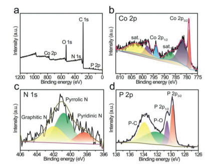 | Fig. 2. XPS spectrum of PA-ZIF-67–900. (a) XPS survey spectrum, (b) Co 2p, (c) N 1s and (d) P 2p high resolution spectrum of PA-ZIF-67–900. | |