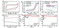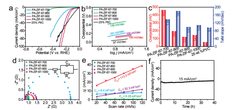 | Fig. 3. HER performance of PA-ZIF-67–900. (a) Polarized LSV curves, (b) Tafel slope, (c) comparison of overpotential at 10 mA/cm2 (red column) and Tafel slope (blue column) for PA-ZIF-67–700 (green), PA-ZIF-67–800 (blue), PA-ZIF-67–900 (red), PA-ZIF-67–1000 (purple) and 25% Pt/C (black). (d) Nyquist plots and (e) current density difference against scan rate of PA-ZIF-67–700 (green), PA-ZIF-67–800 (blue), PA-ZIF-67–900 (red) and PA-ZIF-67–1000 (purple). (f) Chronoamperometric current-time curve of PA-ZIF-67–900. | |