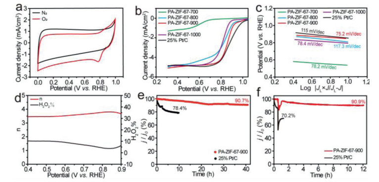 | Fig. 4. ORR performance of PA-ZIF-67–900. (a) CV curves of PA-ZIF-67–900 in the presence of N2 (black) and O2 (red). (b) LSV curves and (c) Tafel slope for PA-ZIF-67–700 (green), PA-ZIF-67–800 (blue), PA-ZIF-67–900 (red), PA-ZIF-67–1000 (purple) and 25% Pt/C (black). (d) Number of electron transfer (left) and H2O2 yield (right) of PA-ZIF-67–900. (e) Normalized current density (j/j0) against time plot and (f) methanol tolerance test of PA-ZIF-67–900 (red) and 25% Pt/C (black). | |