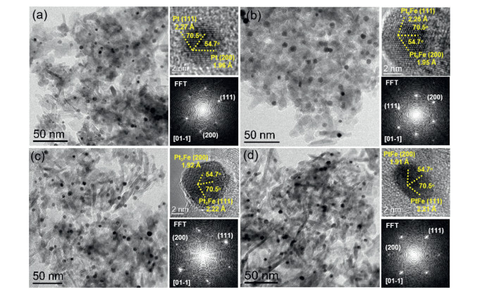 | Fig. 1. TEM, HRTEM images (top right) and corresponding FFT (bottom right) of Pt-Al2O3 (a), Pt9Fe-Al2O3 (b), Pt3Fe-Al2O3 (c) and PtFe-Al2O3 (d), respectively. | |