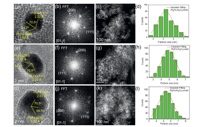 The fresh, used and cycled Pt3Fe-Al2O3 catalysts were collected and further characterized by TEM. The analysis on HRTEM images (Fig. 3) of the fresh, used and cycled Pt3Fe-Al2O3 catalysts indicates that the crystal structure of the catalysts remains unchanged. The FFT patterns also prove that the crystal structure is stable. The HAADF-STEM images and the corresponding particle size statistics (Figs. 3d, h, i) exhibit that Pt3Fe NPs are uniformly dispersed on the Al2O3 supports and no particle growth or agglomeration was detected after reusing.