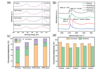 | Fig. 2. Pt 4d XPS spectra (a), in-situ CO-DRIFTS spectra (b) and catalytic performance of PtxFey-Al2O3 (c) and cycling test of Pt3Fe-Al2O3 for CAL hydrogenation to COL (d). Reaction conditions: T = 80 ℃, P = 1.5 MPa, 5 mmol CAL, 30 mg catalysts, 10 mL diethylene dioxide was used as solvent, reaction time: 1 h.gradually shifts to a higher angle with the increase of Fe content (Fig. S2b), which proves that Fe enters Pt lattice and they form platinum iron structure. These results are consistent with the structural features reflected by HRTEM analysis in Fig. 1. | |