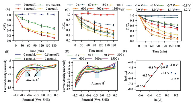 | Fig. 1. ECH performance of Pd/MnO2/Ni foam cathode at different (A) Pd loads, (C) MnO2 loads, and (E) cathode potentials in N2-saturated 0.1 mol/L Na2SO4 solution in the presence of 100 µmol/L of 2, 4, 6-TCP; Cyclic voltammograms recorded for Pd/MnO2/Ni foam cathode under different (B) Pd loads and (D) MnO2 loads at a sweep rate of 1 mV/s; and (F) the relationship between ln kobs and ln(−E) under different cathode potentials. | |