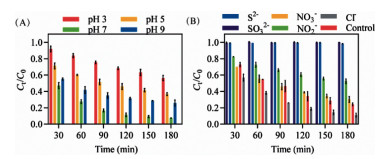 | Fig. 2. Effects of (A) the initial pH and (B) the coexisted ions on 2, 4, 6-TCP removal performance by Pd/MnO2/Ni foam cathode. | |