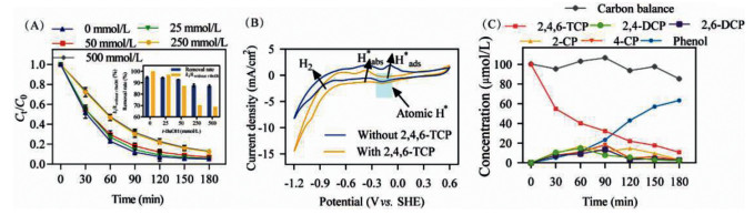 CV curves of Pd/MnO2/Ni foam cathode with or without 2, 4, 6-TCP were conducted to identify the role of H*ads and H*abs in the dechlorination process of 2, 4, 6-TCP. Fig. 3B showed three oxidation peaks were located in potential ranges of −0.80 V to −0.60 V, −0.40 V to −0.20 V, and −0.20 V to −0.00 V assigning to H2, H*abs and H*ads, respectively. The oxidation peak corresponding to H*ads disappeared after the addition of 2, 4, 6-TCP, indicating that H*ads was the key active hydrogen species, while H2 and H*abs were negatively contributed to ECH.