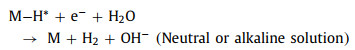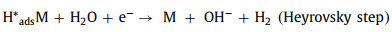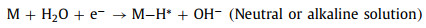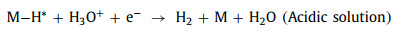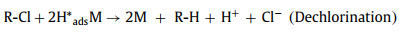 Chemical remediation methods, especially chemical reduction, have been proposed as the most widely used method for detoxifying COCs due to their high efficiency [7]. Among chemical reduction, electrocatalytic hydrodechlorination (ECH) gains ever-growing interest due to its outstanding performance, mild reaction conditions, and convenient operation conditions [8], which has been regarded as a promising alternative in contamination control of COCs. In general, the mechanism of ECH can be summarized in two pathways: i) Direct reduction by direct electron transfer between pollutants and cathode surface [9]; ii) indirect reduction by atomic H* produced in process of water electrolysis [10]. Various previous studies have demonstrated that the latter way, ECH via atomic H*, is the dominant pathway for contaminant removal [11]. Details on the generation of atomic H* in the ECH process are elucidated as following (M represents metal catalyst and adsorbed atomic hydrogen is denoted as H*ads) (Eqs. 1-4) [12]: