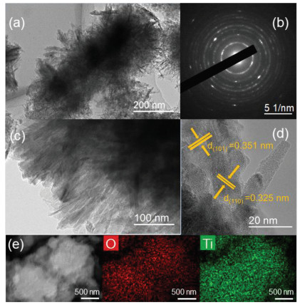 | Fig. 2. (a, b) TEM images, (c) SAED pattern, (d) HRTEM image, (e) SEM image and corresponding elemental mappings of TiO2-A-R sample. | |