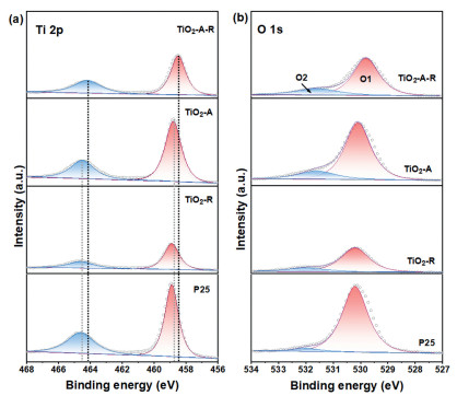 | Fig. 3. XPS spectra of (a) Ti 2p and (b) O 1s over TiO2-A-R, TiO2-A, TiO2-R and P25 samples. | |