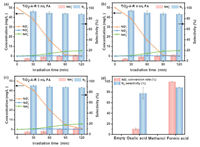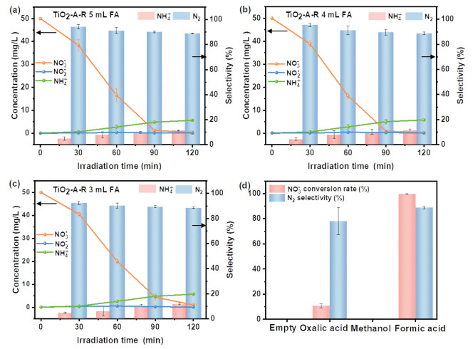 | Fig. 5. Photocatalytic nitrate reduction activity of TiO2-A-R (a-c) with 3–5 mL formic acid and (d) with different hole scavengers. | |