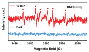 According to the literature, different hole scavengers such as oxalic acid (OC) and methanol may also be favorable for the photocatalytic nitrate reduction [50]. Thus, the 4 mL 0.1 mol/L methanol and OC solution was introduced for photocatalytic NO3− (50 mg/L) reduction experiment as shown in Fig. 5d. The OC involving system demonstrated the NO3− conversion of 11% and the 78% N2 selectivity, which were much lower than that of FA. No NO3− conversions were observed in methanol involving system or hole scavengers absence system, indicating that FA significantly improved the photocatalytic activity [24]. Based on the previous study [51], we confirm that carbon dioxide anion radical (CO2•−) generated by reacting FA with photogenerated holes of photocatalyst has strong reductive ability for NO3− conversion to N2. Then, EPR test was carried out to probe the production of CO2•− in the TiO2-A-R system. As shown in Fig. 6, no signals were detected under dark conditions. While under light irradiation, a six-line DMPO-CO2•− spin adduct signal was formed with hyperfine parameter of magnetic factor g = 2.0059 (Fig. S3b in Supporting information), which can be assigned to reductive CO2•− species for further promoting NO3− degradation [52-54]. These results clearly indicated the important promoted effect of FA in the photocatalytic NO3− reduction reaction using noble-metal free TiO2 as photocatalysts.