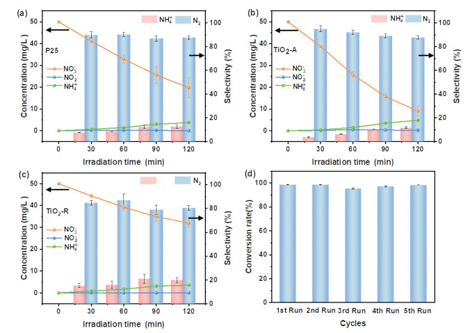 | Fig. 7. Photocatalytic nitrate reduction activity of (a) P25, (b) TiO2-A, and (c) TiO2-R samples. (d) Cycling stability test of TiO2-A-R. | |