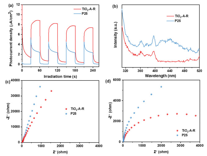 | Fig. 9. (a) Photocurrent density, (b) PL spectra (ex = 290 nm), electrochemical impedance spectra (c) in dark and (d) light irradiation of TiO2-A-R and P25 samples. | |