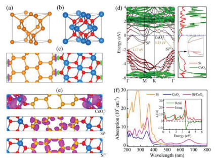 | Fig. 1. The unit cell of (a) Si in a diamond cubic crystal structure and (b) CeO2 in a fluorite structure. (c) The geometric structure and 3D charge density difference of Si/CeO2 nanocomposite with an isovalue of 0.001 e/Å3. Green and purple isosurfaces represent charge accumulation and depletion, respectively. (d) Band structures (left panel) and PDOS (right panel) of Si/CeO2 heterojunction. The red circles and green squares in the left panel denote the projection to Si and CeO2 constituents, respectively. (e) The electronic density distribution of CeO2L, SiL and SiH, with an isovalue of 0.02 e/Å3. (f) The absorption spectra of Si, CeO2 and Si/CeO2 heterojunction, and the inset denotes the calculated dielectric function of Si/CeO2 heterojunction, including both real and imaginary parts. Red, yellow, and blue spheres represent O, Si, and Ce atoms, respectively. | |