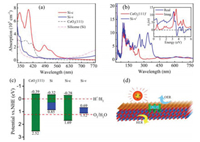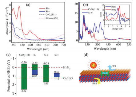 | Fig. 4. (a) The optical absorption spectra of CeO2(111) and silicene individuals, as well as Si-c, Si-v heterojunctions. (b) The comparison of absorption spectra for CeO2(111)' and Si-v', and the inset denotes the calculated dielectric function of Si/CeO2 heterojunction, including both real and imaginary parts. (c) Calculated VBM and CBM potentials versus normal hydrogen electrode of CeO2(111), silicene, Si-c, and Si-v. The upper and lower red dashed lines stand for the proton reduction potential (H+/H2) and oxygen reduction potential (O2/H2O) for water splitting with values of 0 and 1.23 eV, respectively. (d) Schematic diagram of photocatalytic water splitting for Si-c, as well as the electron transfer during the photocatalytic process. | |