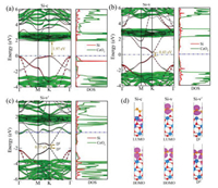 | Fig. 3. Three-dimensional charge density difference for the (a) Si-v, (b) Si-c and (c) Si-v'. The purple and cyan iso-surfaces denote charge accumulation and depletion in the space, respectively. The horizontal dash dot lines denote the central location of each atomic layer. (d) Profile of the planar averaged charge density difference as a function of positions in the z-direction. The positive and negative values of ρ denote the charge accumulation and depletion, respectively. | |