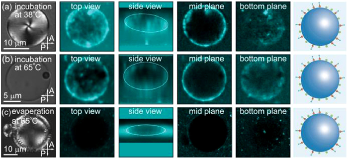 To confirm that local high-density distributions of phospholipids at the LC/water interface are caused and locked by smectic layers that develop at the interface, different sets of control experiments are carried out. When the LC droplets, which are prepared by evaporating chloroform at 25 ℃ and show local high-density phospholipids, are incubated at 38 ℃ for 2 h, smectic LC droplets transition to nematic LC droplets, showing typical four dark brushes with director fluctuation under crossed polarizers, as shown in the leftmost panel of Fig. 3a. Interestingly, local high-density distributions of phospholipids essentially disappear after incubation, showing a relatively homogeneous coverage of phospholipids on the surface of nematic LC droplets, as shown in the fluorescent confocal microscope images of Fig. 3a. Compared with smectic LCs, nematic LCs have a much larger molecular mobility as evidenced by the director fluctuation. Therefore, local high-density distributions of phospholipids developed and locked in the smectic phase could be relaxed in the nematic phase at high temperature. Similarly, when the LC droplets are incubated at 65 ℃ for 2 h, LC droplets transition from smectic to isotropic, in which LC molecules also have a large molecular mobility, and relatively homogeneous distributions of phospholipids are observed on the surface of isotropic LC droplets, as shown in Fig. 3b.