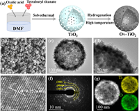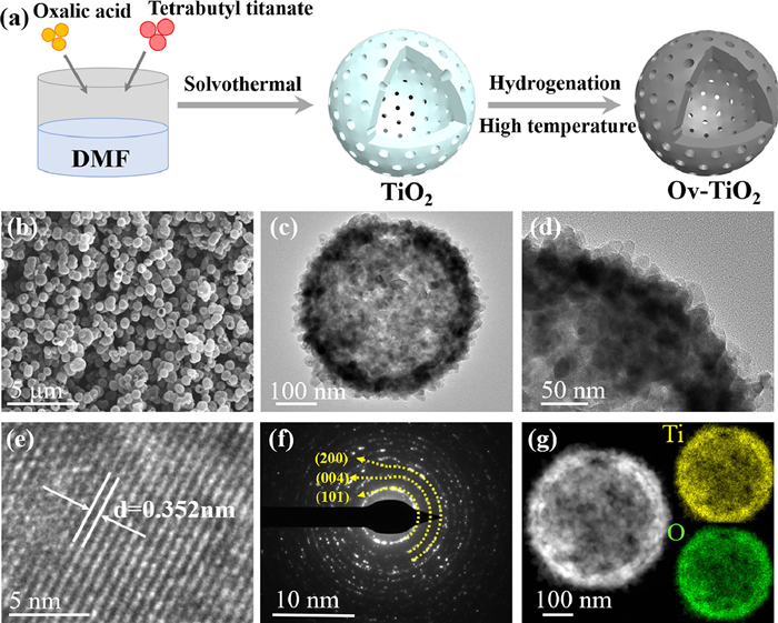| Fig. 1. (a) Schematic illustration of the preparation process of Ov-TiO2-T, (T = 550, 600, 650 and 700). (b) SEM image, (c, d) TEM images, (e) HRTEM image, (f) SAED image, and (g) HAADF-STEM image and EDX elemental mapping images of Ov-TiO2-650. | |