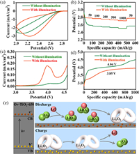 | Fig. 4. (a) CV curves of Li-O2 cells with and without illumination at 0.5 mV/s with 2.0–2.9 V vs. Li/Li+. (b) Rate capability of Li-O2 cells during the discharge process with and without illumination, (c) the LSV curves for the Li-O2 cells with preloaded Li2O2 cathodes with and without illumination at 0.2 mV/s. (d) Charge curves of the Li-O2 cells with preloaded Li2O2 cathodes with and without illumination at 500 mA/g. (e) Schematic diagrams of the reaction mechanisms for the photo-assisted Li-O2 batterie with Ov-TiO2-650. | |