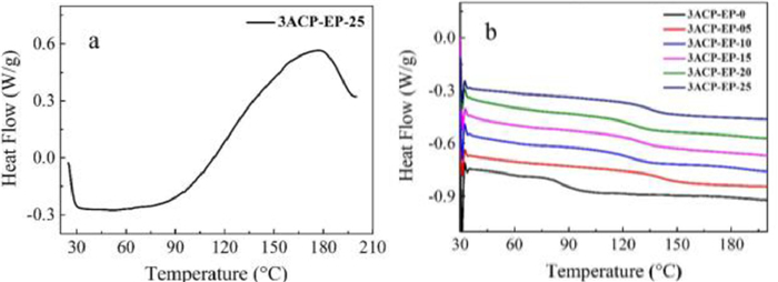 | Fig. 1. DSC curves of (a) 3ACP-EP-25 before curing and (b) 3ACP-EP-0 ~ 3ACP-EP-25 samples after curing process. | |