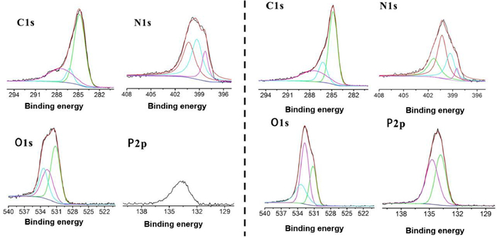 | Fig. 6. C 1s, O 1s, N 1s and P 2p XPS spectra of the char residue of 3ACP-EP-0 (left) and 3ACP-EP-25 (right) after heated at 600 ℃. | |