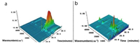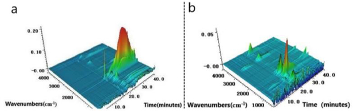 | Fig. 7. 3D TG-FTIR spectrum of the gas phase in the thermal degradation of (a) 3ACP-EP-0 and (b) 3ACP-EP-25. | |