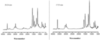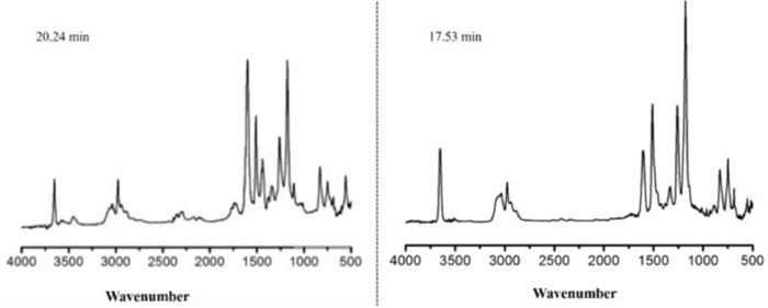 | Fig. 8. FTIR spectrum of pyrolysis products for 3ACP-EP-0 (left) and 3ACP-EP-25 (right) at the maximum decomposition rate. | |