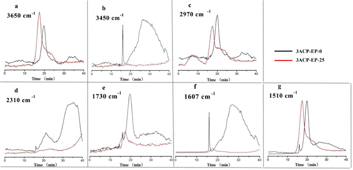 TG-FTIR test is performed to analyze the gas products evolving during the thermal degradation of 3ACP-EP-0 and 3ACP-EP-25 (Fig. 7). The 3D TG-FTIR spectra of the gas phase of 3ACP-EP-0 sample during thermal degradation are shown in Fig. 7a. The presence of evolved gases can be clearly identified by the strong FTIR characteristic peak positions, such as methane (3015 cm−1), carbon dioxide (2360 cm−1), and water (3650 cm−1) [25]. The intensive peaks at 1607 and 1433 cm−1 correspond to the evolution of a large number of aromatic rings due to the severe thermal decomposition process caused by the fracture of the epoxy structure (Fig. 7a). However, further decomposition is not observed after the completion of the first decomposition cycle (at about 17~20 min, Fig. 7b), besides the release of a small amount of aromatic ring is observed from 3ACP-EP-25 sample.