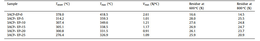 Thermal resistance is one of the most important properties of epoxy thermosets because it establishes the service environment for epoxy-based functional materials. TGA measurement is applied to investigate the thermal stability of 3ACP-EP epoxy thermoset curing system. Fig. 5 shows the TG and DTG curves of all epoxy thermosets which are heated from 30 ℃ to 800 ℃ under a nitrogen atmosphere with a heating rate of 10 ℃/min. Table 2 shows the temperature at the mass loss rate reaching 5% (Tonset) of the epoxy samples and the temperature at the mass loss rate (Tmax). Besides, the maximum mass loss rate (Vmax) and the char residue of the samples at 600 and 800 ℃ have also been studied.