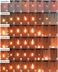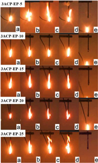 | Fig. 3. Schematic diagram of UL-94 vertical combustion process of 3ACP-EP products. Second ignition process: (a) ignition 1 s; (b) ignition 5 s; (c) ignition 8 s; (d) ignition 10 s; (e) 1 s away from the flame. | |