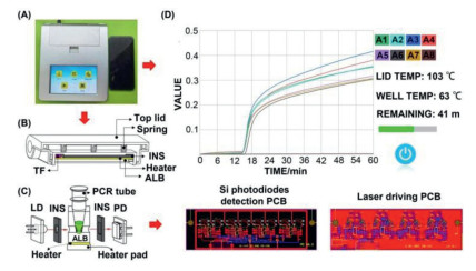 | Fig. 1. (A) The design of the diagnostic device. (B) Heating cover module. (C) Reaction module. (D) Touch screen interfaces. | |