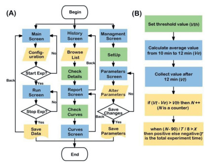 The flow of the judgment algorithm (Fig. 2B) for the experiment is implemented by the touch screen. The program collects the voltage value of one channel by 8 s, calculates the average value (Ve) of each channel from 10 min to 12 min as baseline value, then timely collects the value (Vt) after 12 min. If the difference between Vt and Ve is greater than the threshold (Vth) which is used to judge whether the curve takes off, the counter (N) will plus one. Finally, the following formula (Eq. 2) is used to judge the results of the experiment: